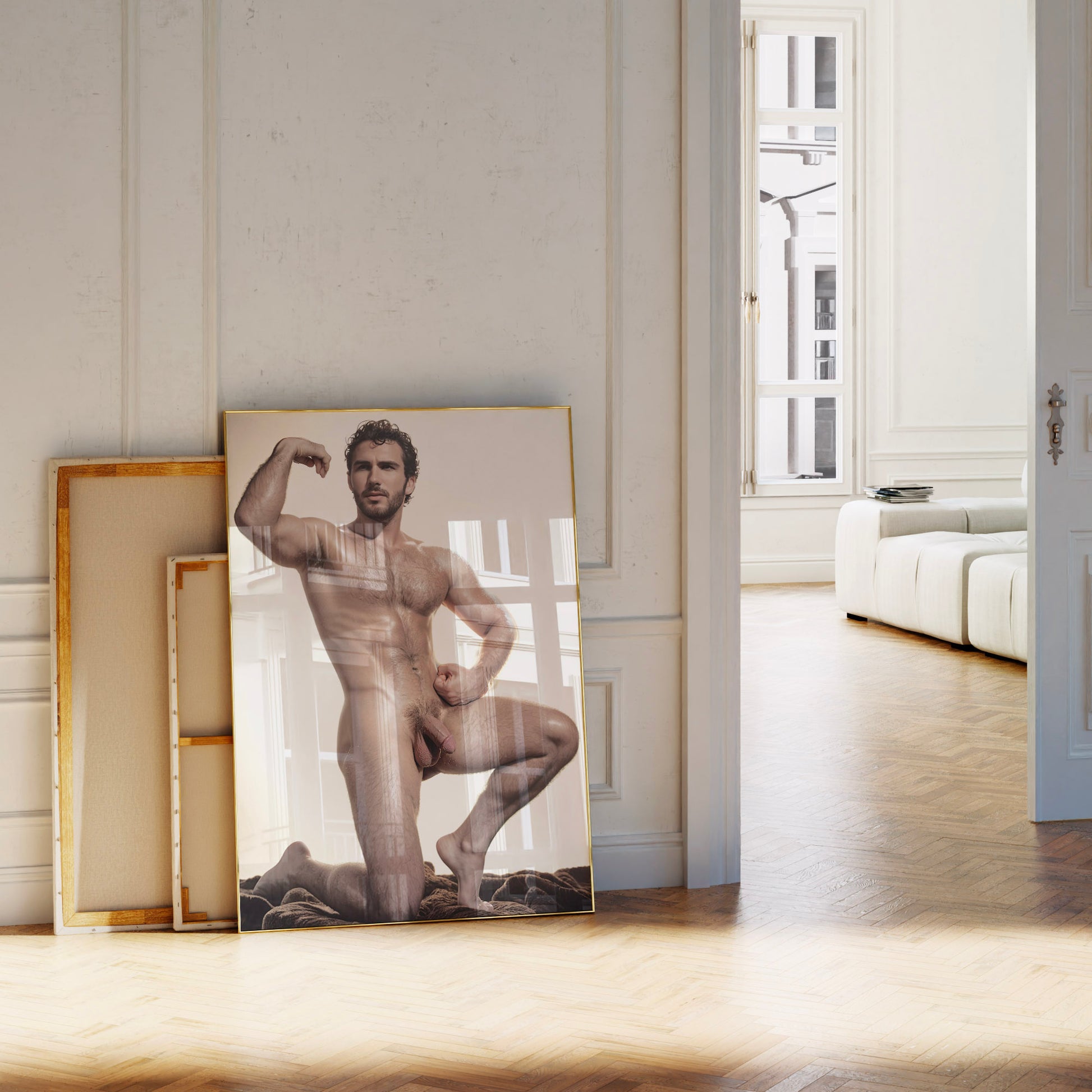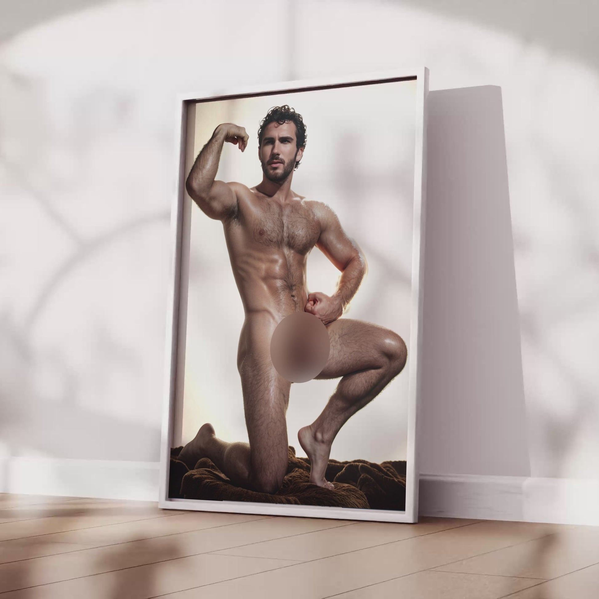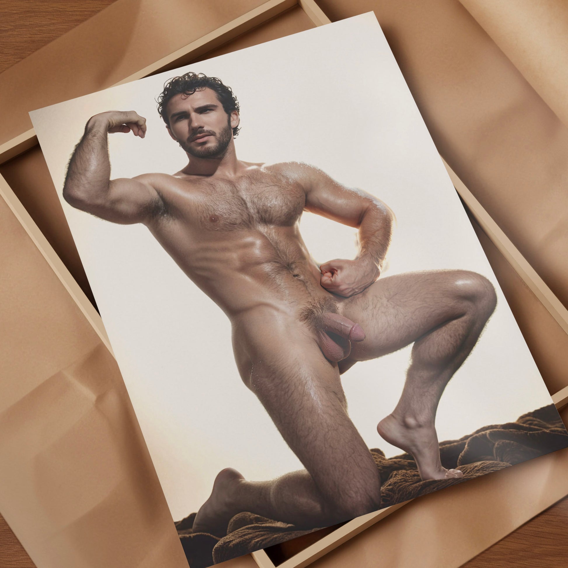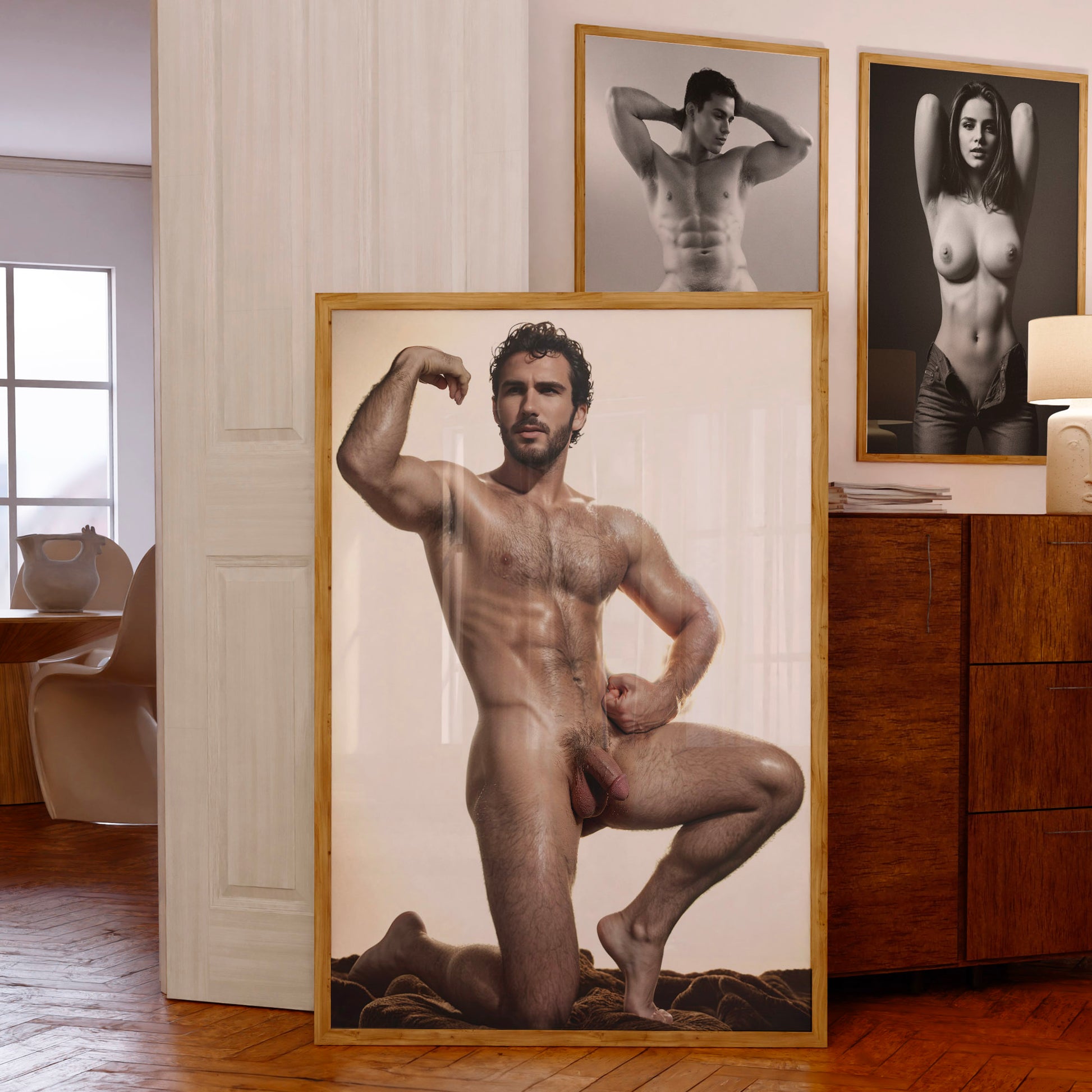 Handsome Nude Man with Big Penis, Vintage Muscular Nude Bodybuilder Vibe, Man Posing Showing Naked Physique in Big Dick Pic, Gay Art & Decor